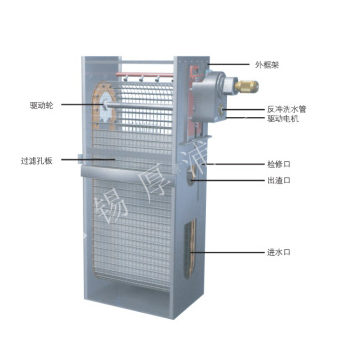 內進流式網板格柵除汙機的機架為不鏽鋼板材與型鋼組裝、焊接成的一整體式長方體剛性結構。機架下部迎水端開有一個進水洞口,機架的前後壁板上設有導軌,其上部還設有一內部集渣槽,並延伸至機外。機架安裝於格柵井的中央,機架的兩側與格柵井之間的間隙為格柵濾後出水的通道。在機架的迎水端兩側布置了導流擋板,其在導流的同時,可防止漂浮垃圾通過。