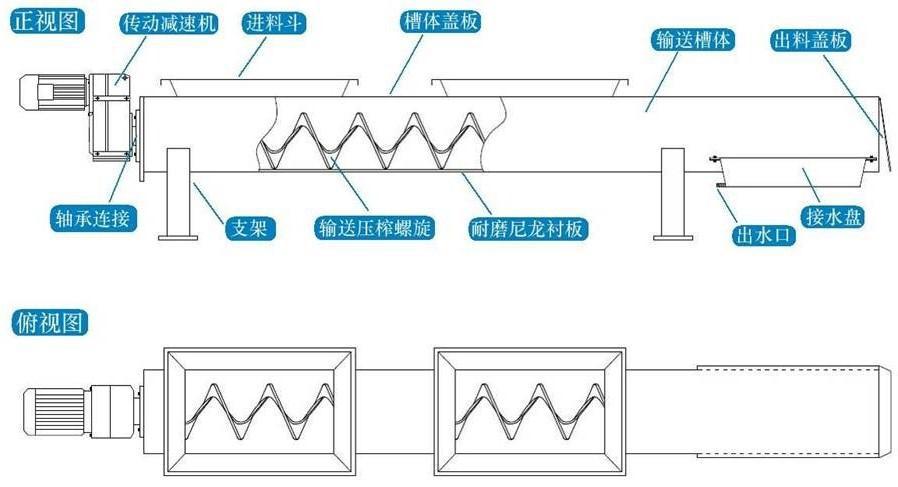該壓榨機輸送壓榨殼體采用U型槽式結構,上部封蓋板,為增加出料高度,一般為平送出料。 壓榨螺旋采用無軸螺旋,下襯耐磨尼龍襯板,增加了輸送長度,壓榨部分為平送壓榨結構。 可同時接受多台格柵出料,輸送加壓榨一體,減少了動力消耗及設備投資。